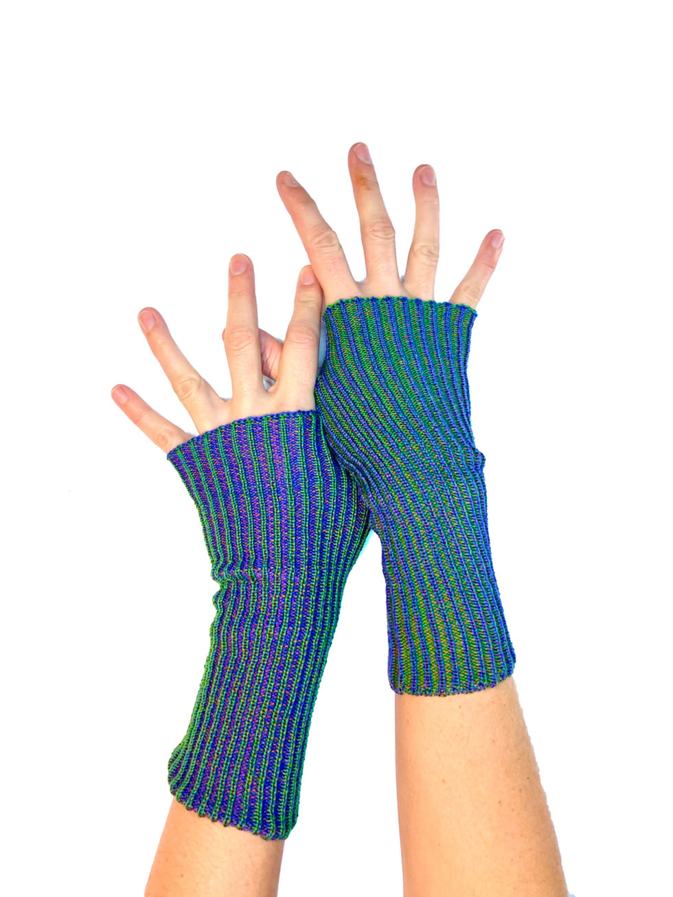 These mittens are made from a knit inspired by our signature lenticular knit. The surface seems to shift in color depending on the viewing angle, almost as if it were lit from above by a soft neon glow.