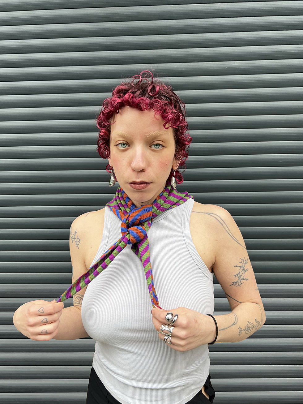Designed to be worn multiple ways → around the neck, on the head, right side out or inside out → offering versatile styling in one compact piece.
